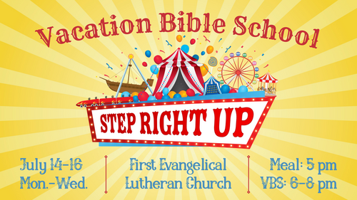 Come one! Come all! Step Right Up and see the marvelous wonders waiting for you at our carnival! First Evangelical Lutheran Church Vacation Bible School: Step Right Up will be held at church on July 14-16, 2025.